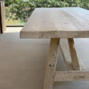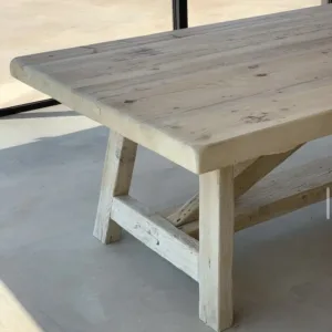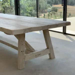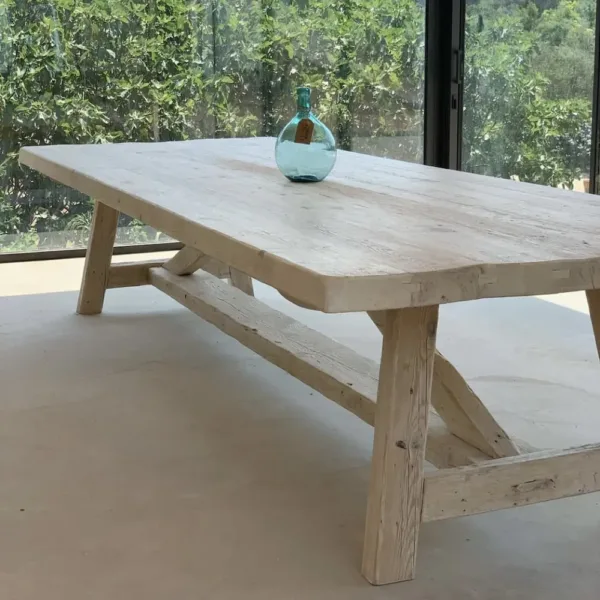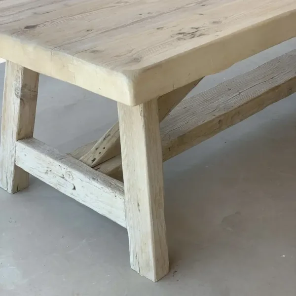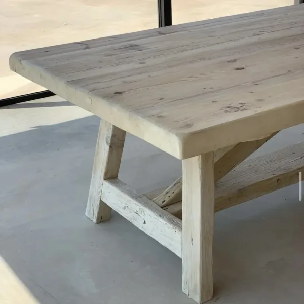 Mesa fabricada en pino viejo recuperado, con un sobre robusto y natural en acabado liso texturizado y tono blanqueado (T001).