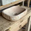 Tallada a mano en piedra Crema Marfil, la pica «Alba» es una pieza de líneas orgánicas y textura natural. Su acabado rústico y suave tono marfil aportan luminosidad y serenidad al baño, evocando la claridad de un amanecer mediterráneo.