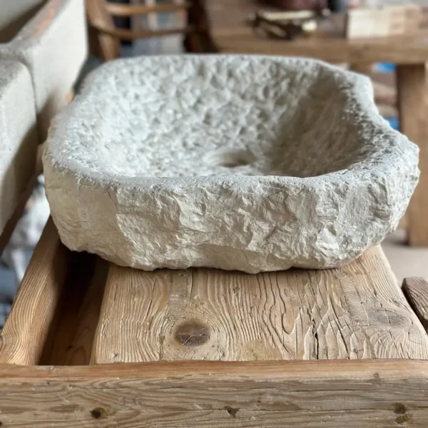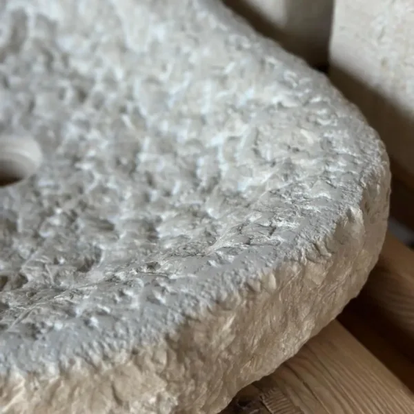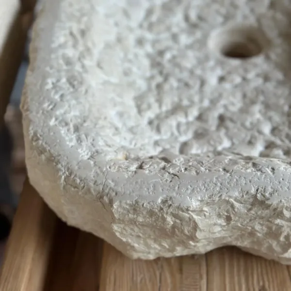 La pica de piedra "Alba" combina la suavidad del Crema Marfil con un tallado rústico que conserva la esencia natural del material. Su forma irregular y superficie en bruto transmiten la autenticidad de una pieza trabajada a mano, mientras que su color claro refleja la luz, creando ambientes acogedores y sofisticados.