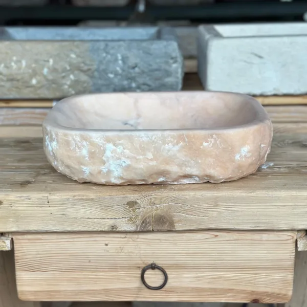 La pica «Alvor» está tallada a mano en piedra natural de Portugal, con un característico tono cálido que aporta luminosidad y elegancia. Su exterior en bruto refleja la autenticidad de la roca, mientras que el interior suavemente pulido garantiza confort y practicidad en el uso diario.