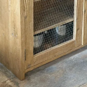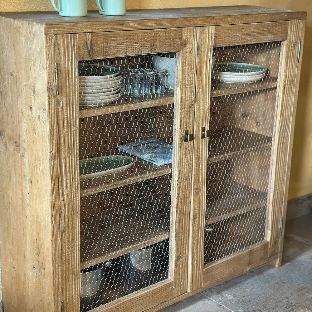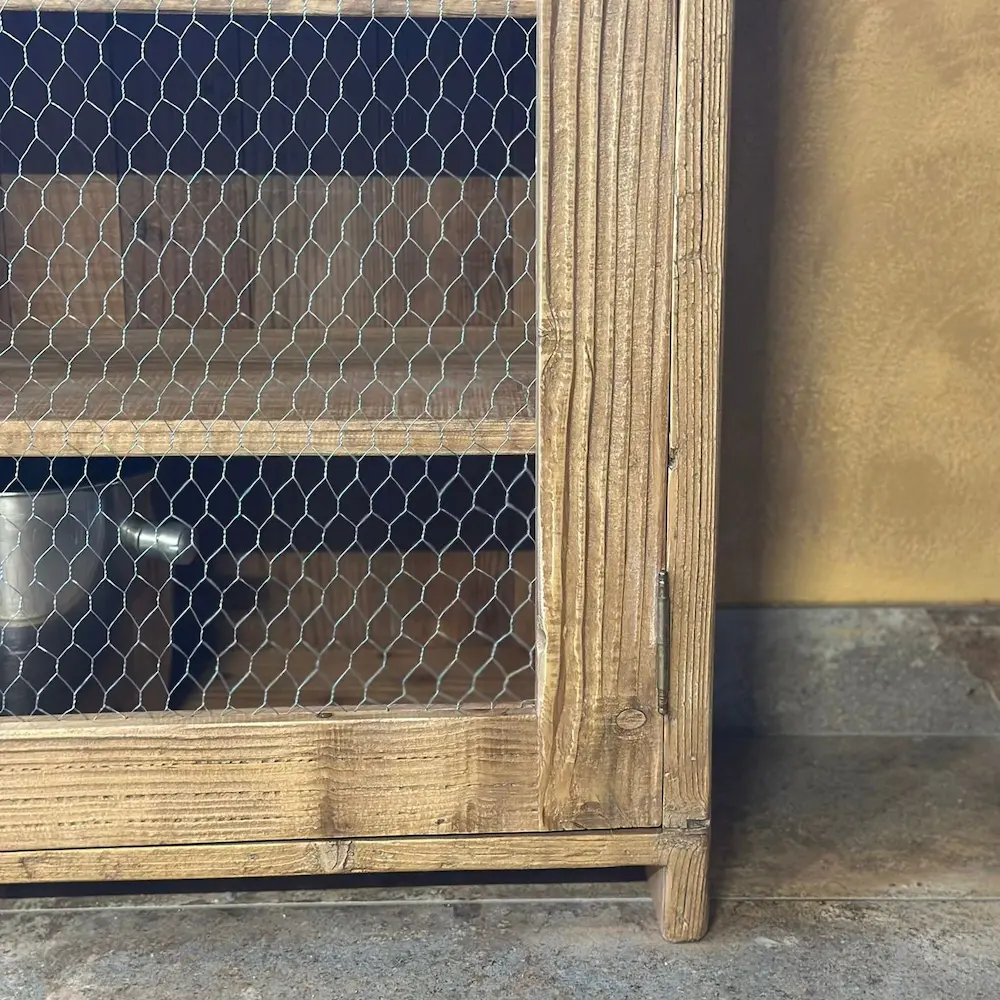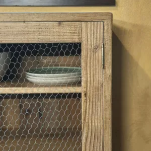 Mueble de inspiración farmhouse con frente en malla de gallinero y estructura de pino viejo recuperado. Su acabado rústico en color natural y tiradores de latón aportan calidez y carácter. Ideal para cocina, comedor o entrada para lucir objetos con encanto.