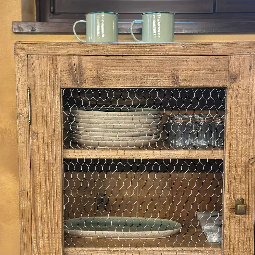 La vitrina “Bosc” reinterpreta los muebles de despensa tradicionales con una presencia cálida y auténtica. El pino viejo recuperado conserva marcas y texturas que cuentan su historia, mientras que la malla de gallinero aligera el conjunto y permite ver el interior con un punto decorativo muy honesto y natural.
