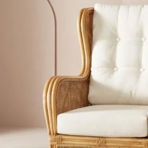 La butaca “Portofino” es una pieza que transmite serenidad y elegancia natural. Su estructura de ratán trenzado a mano envuelve el asiento con formas suaves, creando un respaldo alto que invita al descanso. Los cojines tapizados en lino claro aportan un contraste delicado y un confort que la convierte en el lugar perfecto para relajarse.