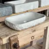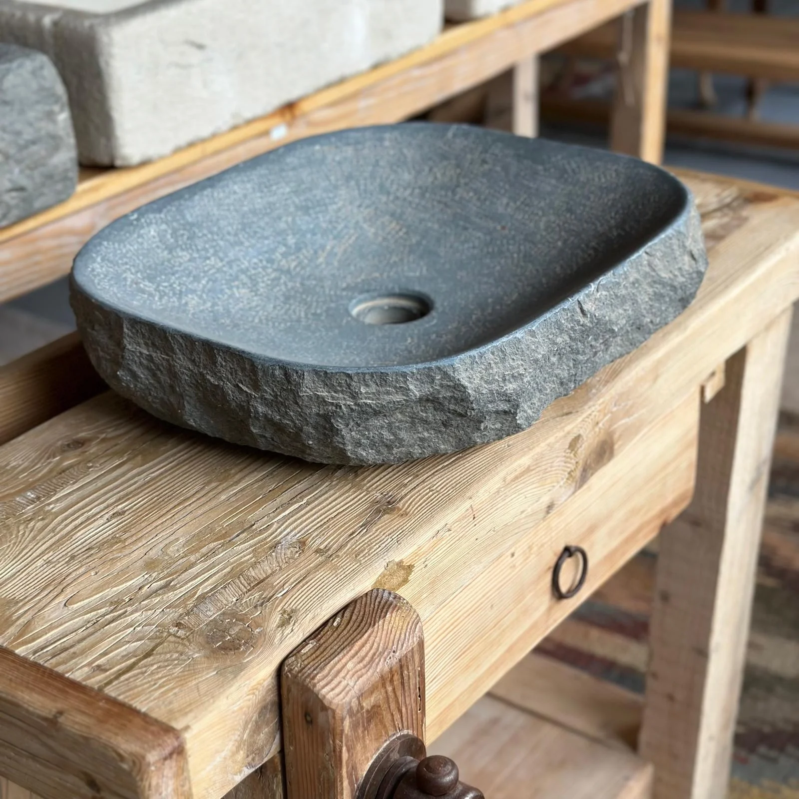 Sólida, sobria y auténtica, «Cenia» está tallada a mano en piedra natural de Tarragona. Su textura marcada y su color grisáceo la convierten en una pieza con carácter propio, ideal para baños con esencia mineral y natural.