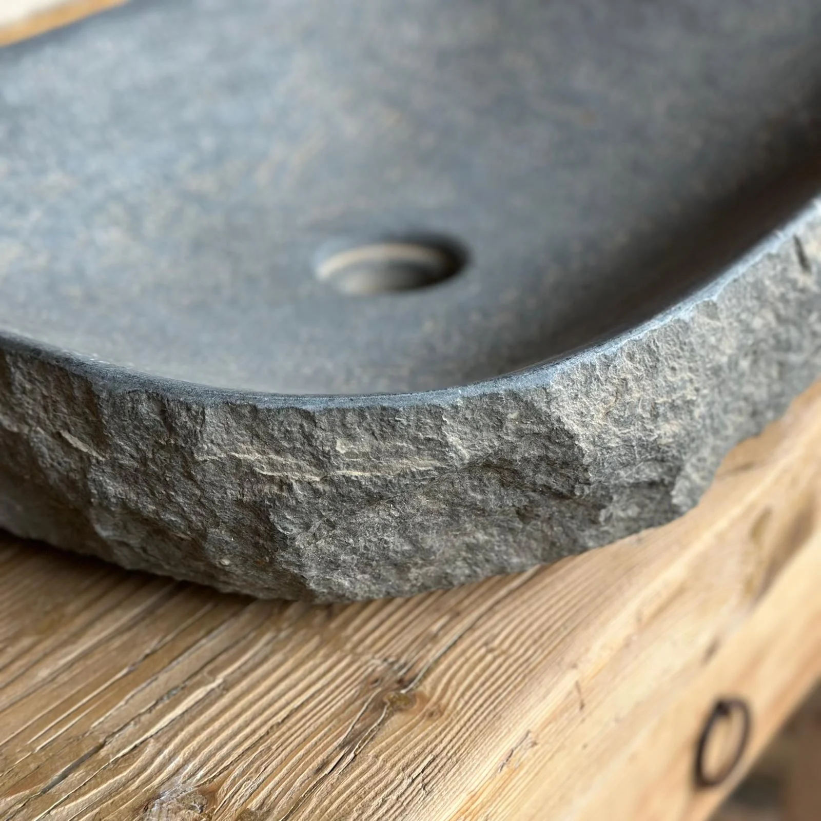 La pica "Cenia" es un tributo a la piedra en estado puro. Su superficie exterior mantiene la textura natural del bloque original, mientras que el interior, suavemente trabajado, respeta la forma orgánica del material. Su tono gris terroso, salpicado de matices más oscuros, aporta profundidad visual y una sensación de autenticidad difícil de imitar.