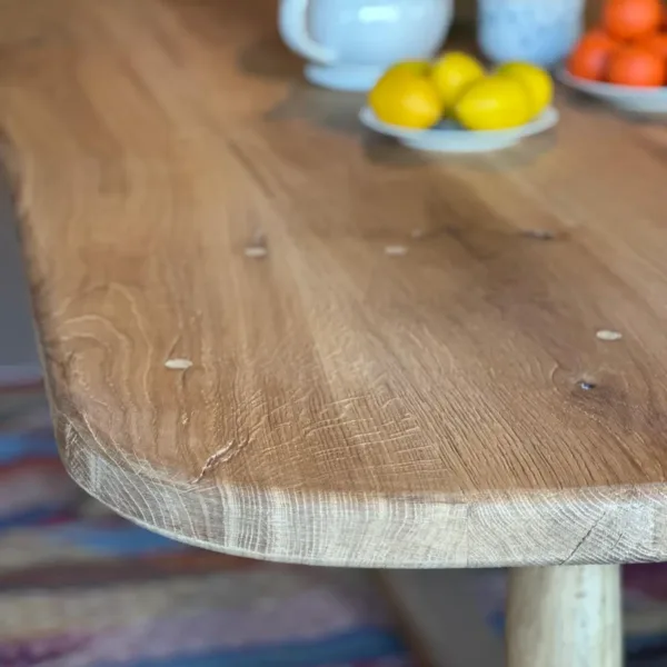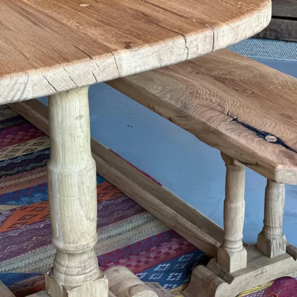 Mesa ovalada de roble viejo recuperado, con un elegante acabado liso texturizado en color roble blanquecino. Su sobre sin diseño de 4 cm de grosor descansa sobre cuatro patas torneadas talladas a mano, que aportan carácter y un aire artesanal único.