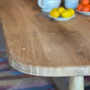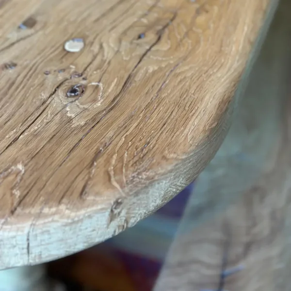 Fabricada en roble viejo recuperado, su sobre ovalado de acabado liso texturizado aporta un estilo natural y acogedor, realzado por el sutil tono roble blanquecino que le otorga luminosidad y versatilidad.