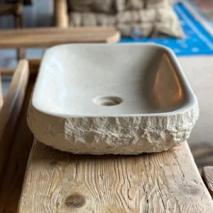 "Empordanesa" es una pica que respira calma. Su diseño alargado, de bordes redondeados y textura natural, la convierte en una pieza atemporal ideal para baños que buscan una atmósfera sencilla, cálida y con carácter. Tallada completamente a mano en piedra natural Crema Marfil, conserva la textura rugosa del exterior contrastando con el interior pulido, creando un equilibrio entre naturaleza y comodidad.