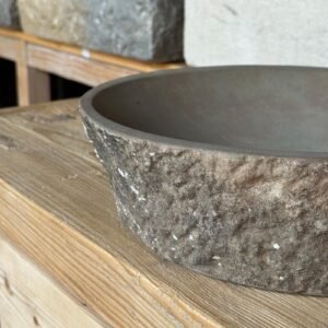 La pica «Fitor» está tallada en piedra recuperada, aportando autenticidad y sostenibilidad. Su acabado exterior en bruto conserva la esencia de la roca, mientras que el interior pulido ofrece comodidad y practicidad. Una pieza única que combina diseño rústico, respeto al entorno y carácter artesanal.