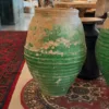 Los trazos oscuros y las texturas desgastadas de su superficie le dan un aspecto envejecido, evocando historias de épocas pasadas cuando estas piezas eran esenciales para fermentar y conservar preciosos líquidos. En la base, una abertura funcional apunta a su propósito original como recipiente de almacenamiento. Esta prenda no sólo tiene un valor estético, sino que también es un símbolo de la conexión entre la artesanía y la vida cotidiana de las culturas antiguas.