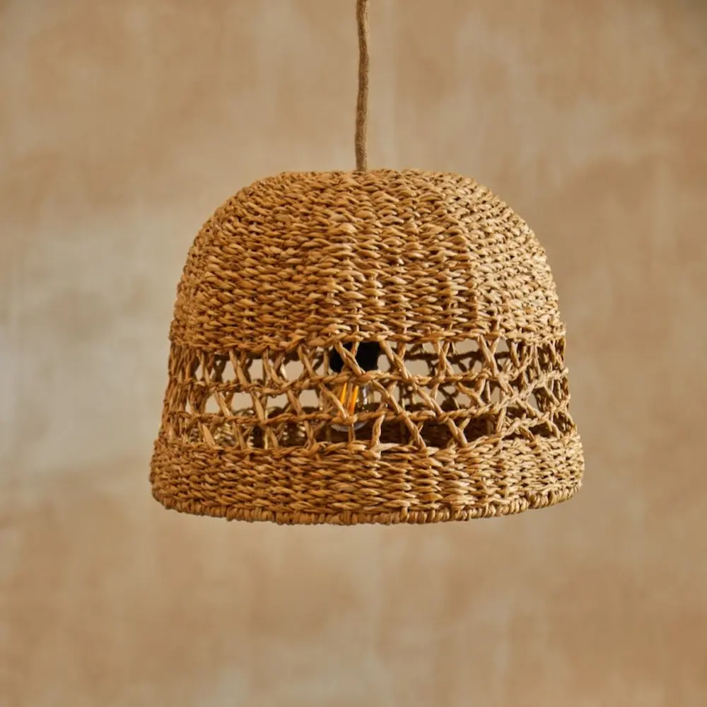La lámpara “Malia” combina simplicidad y carácter en una pieza compacta y versátil. Su diseño, trabajado completamente a mano en junco de mar, alterna un tejido cerrado en la parte superior e inferior con un entramado abierto que deja que la luz respire y dibuje sombras cálidas allí donde se instala.