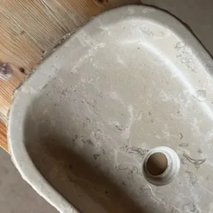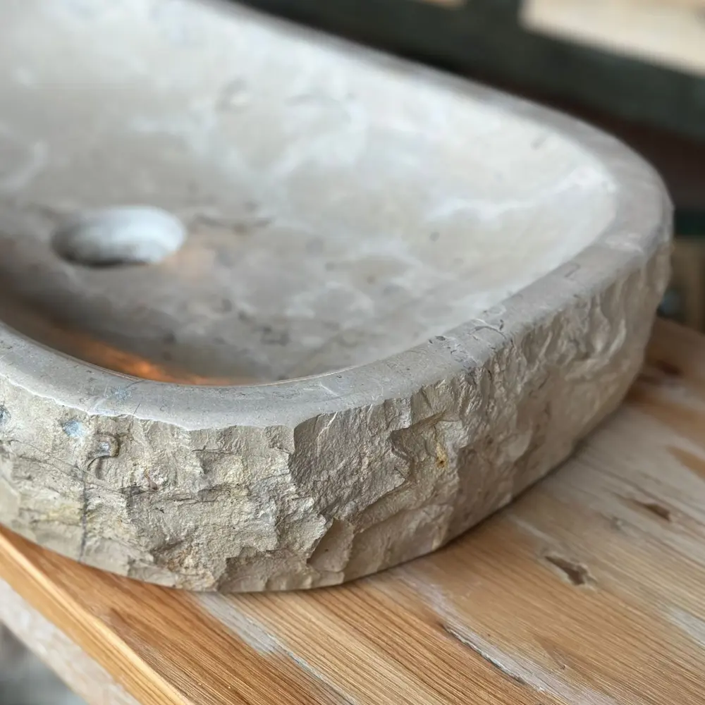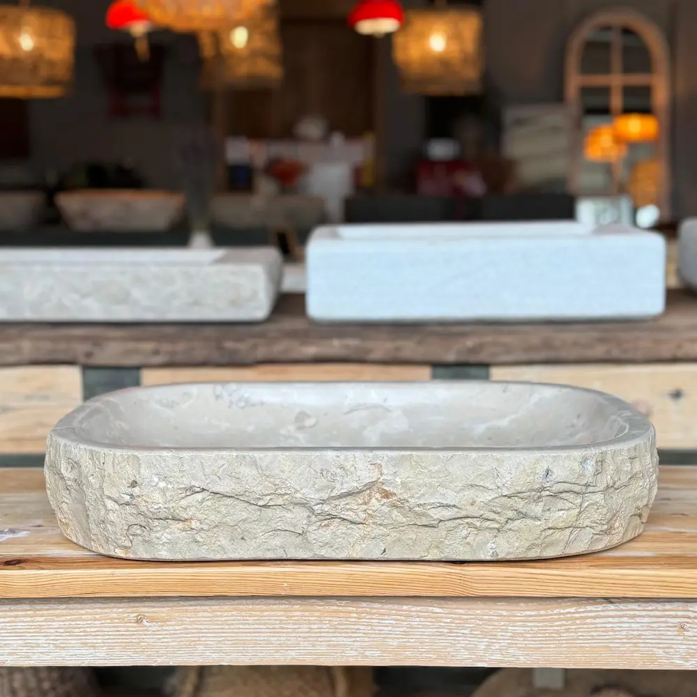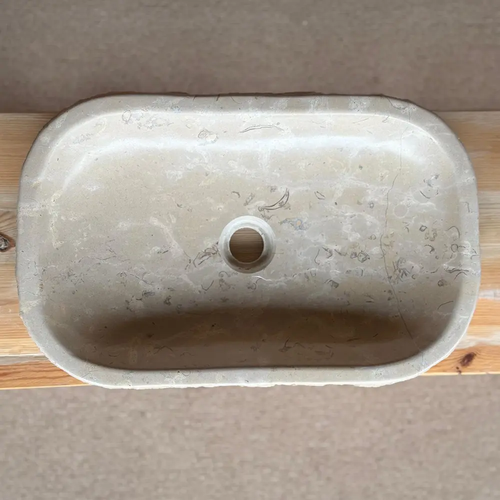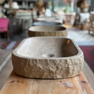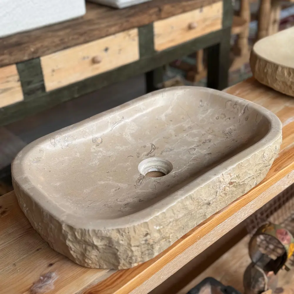Lavabo tallado a mano en piedra Senia de tono arena, con exterior rústico y interior pulido de cantos redondeados. Su forma rectangular suave aporta calidez mediterránea y carácter natural al baño. Durable, fácil de mantener y pieza única.