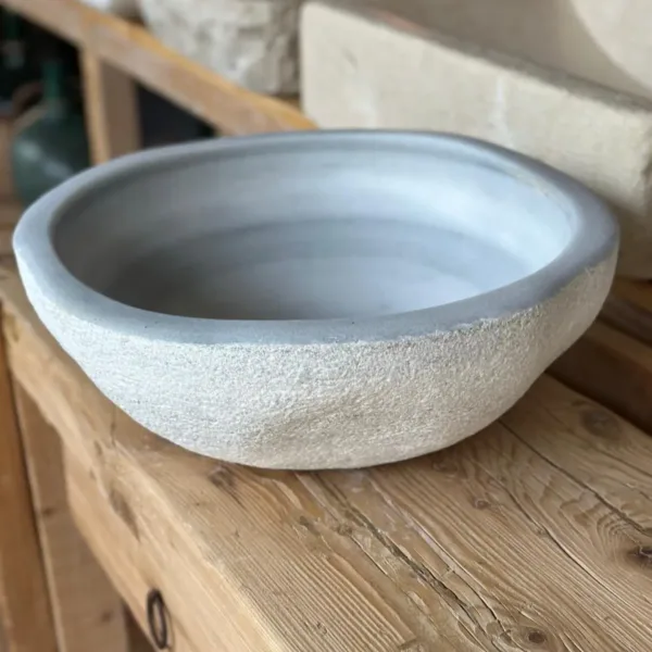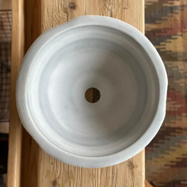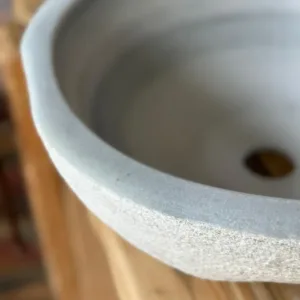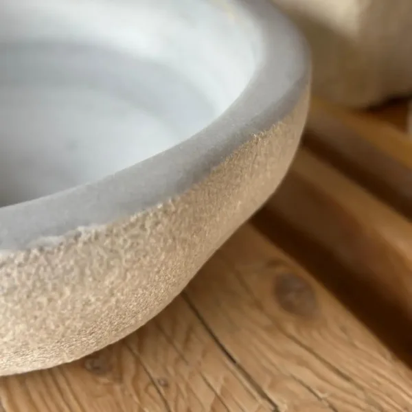 La pica de mármol "Luna" representa la elegancia serena de la piedra natural. Su forma redonda y sus bordes suavemente biselados invitan al tacto, mientras que su superficie exterior arenada aporta un contraste sutil con el interior pulido.