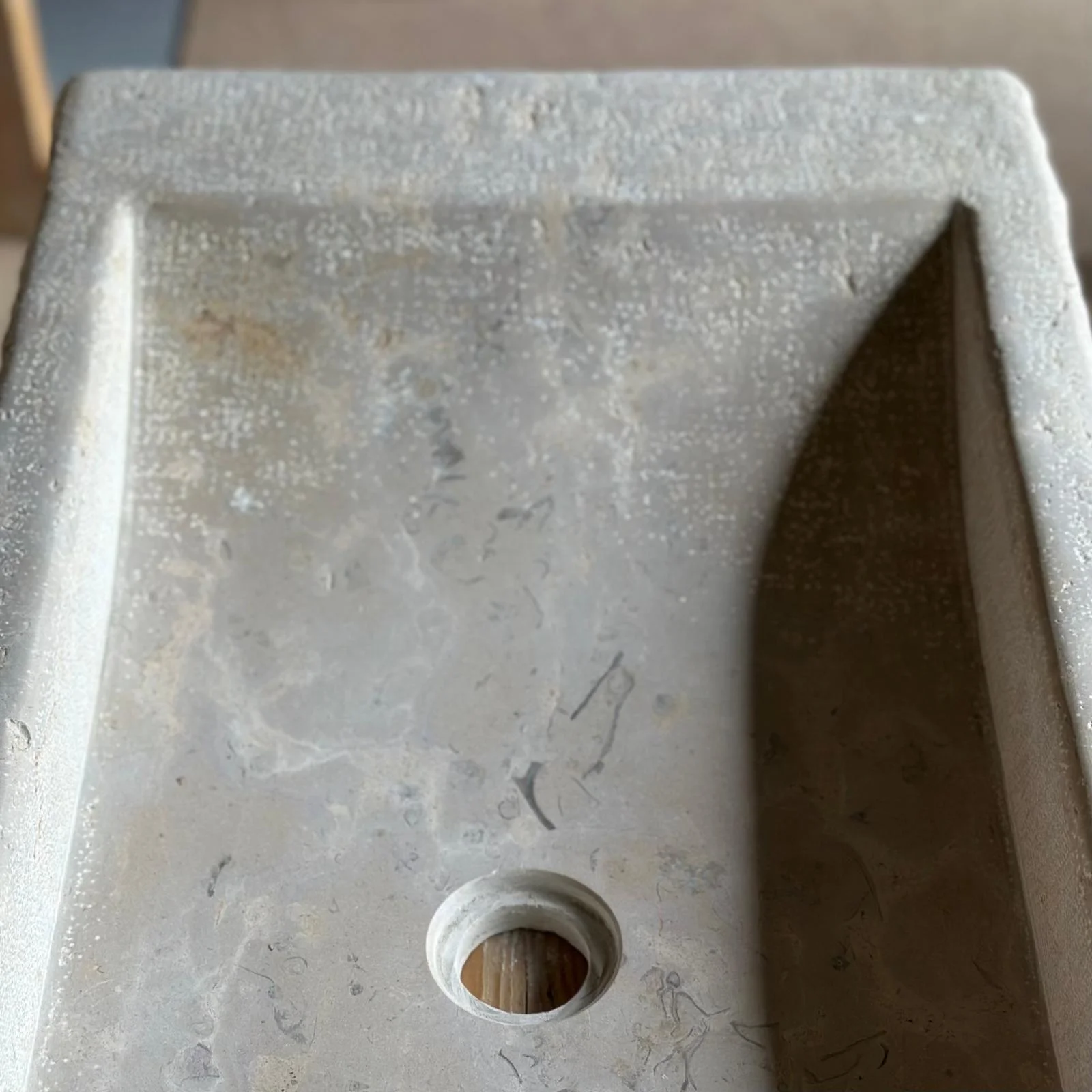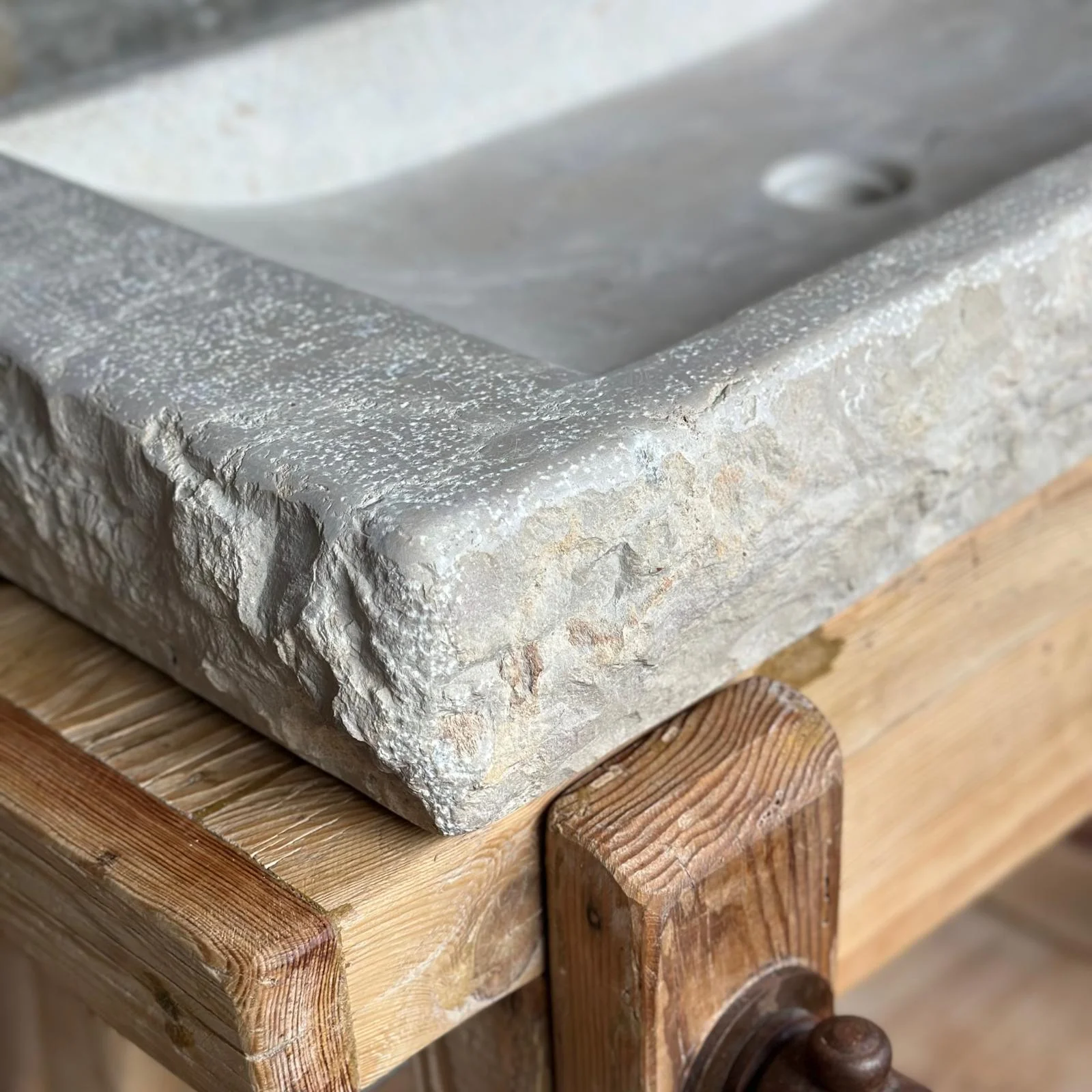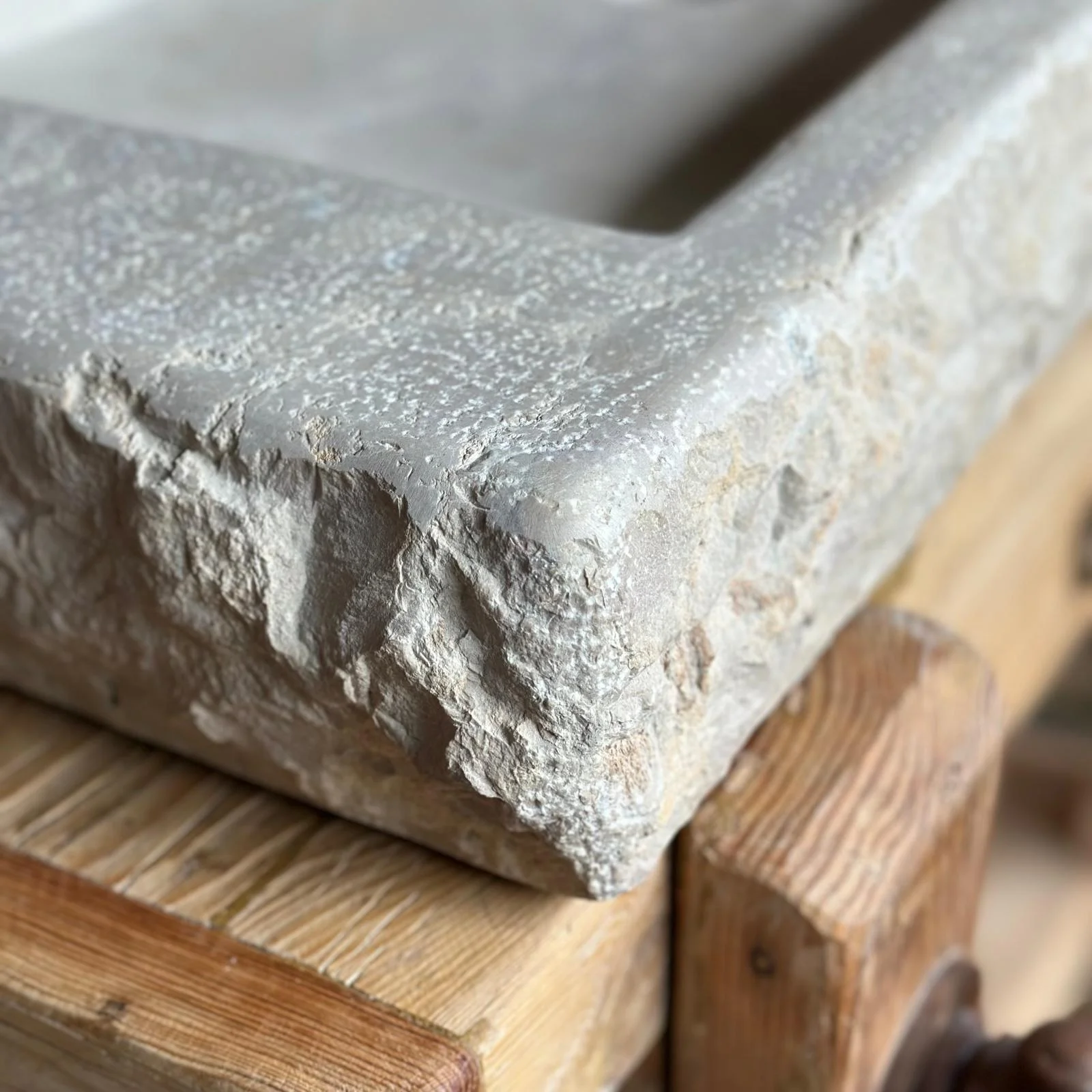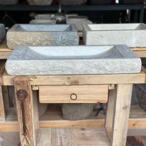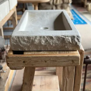 El exterior mantiene la textura viva del bloque original, mientras que el interior se pule con cuidado para ofrecer una superficie suave, cómoda y elegante. Su forma recta y baja permite integrar la pica sobre encimera con gran armonía visual.