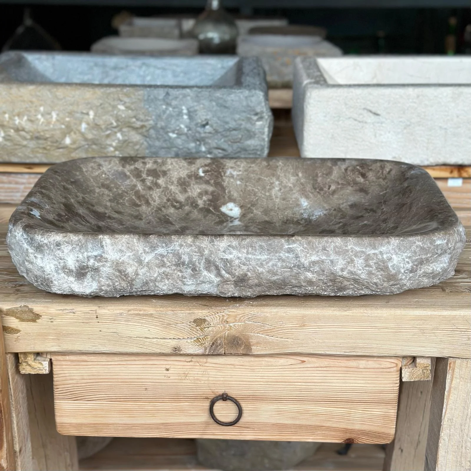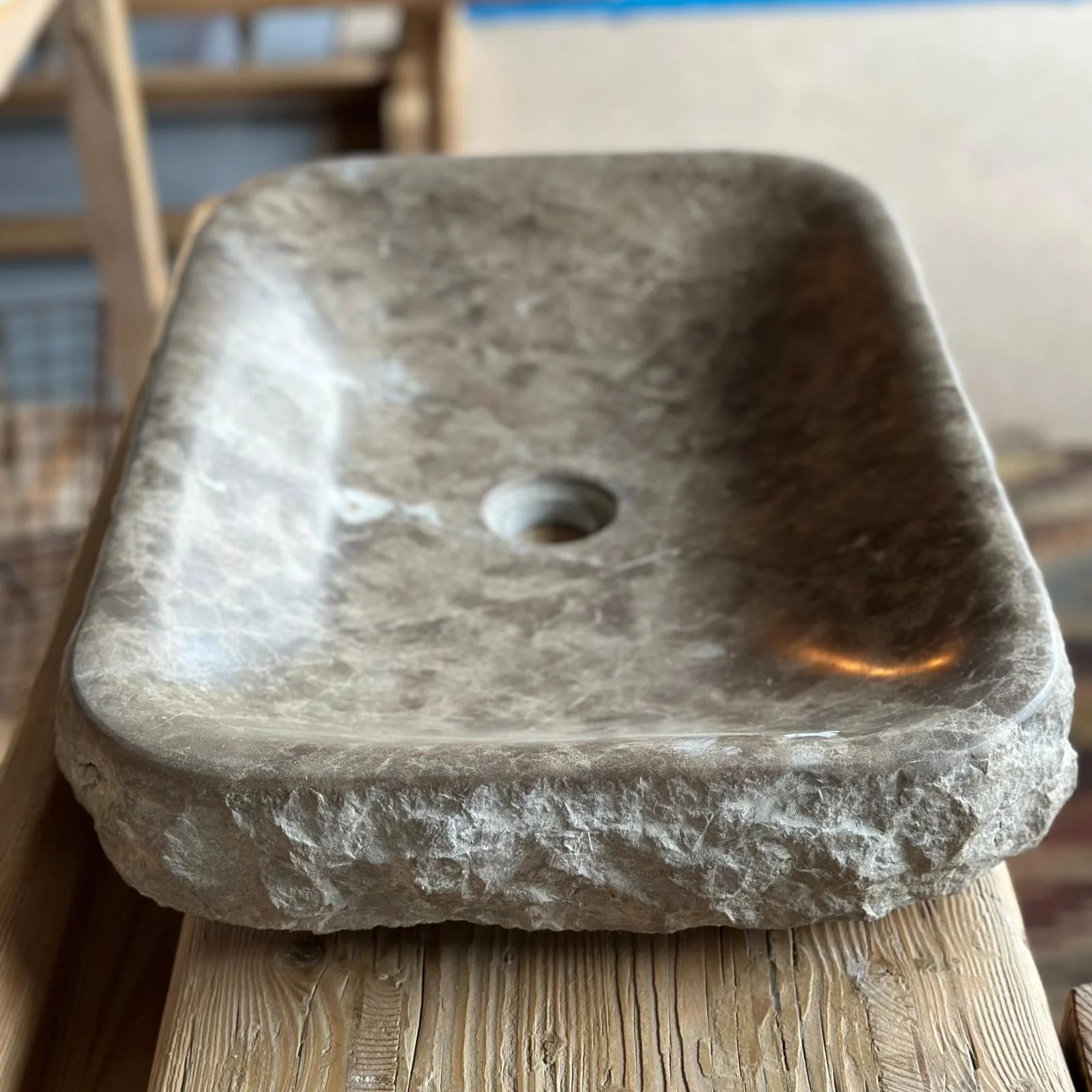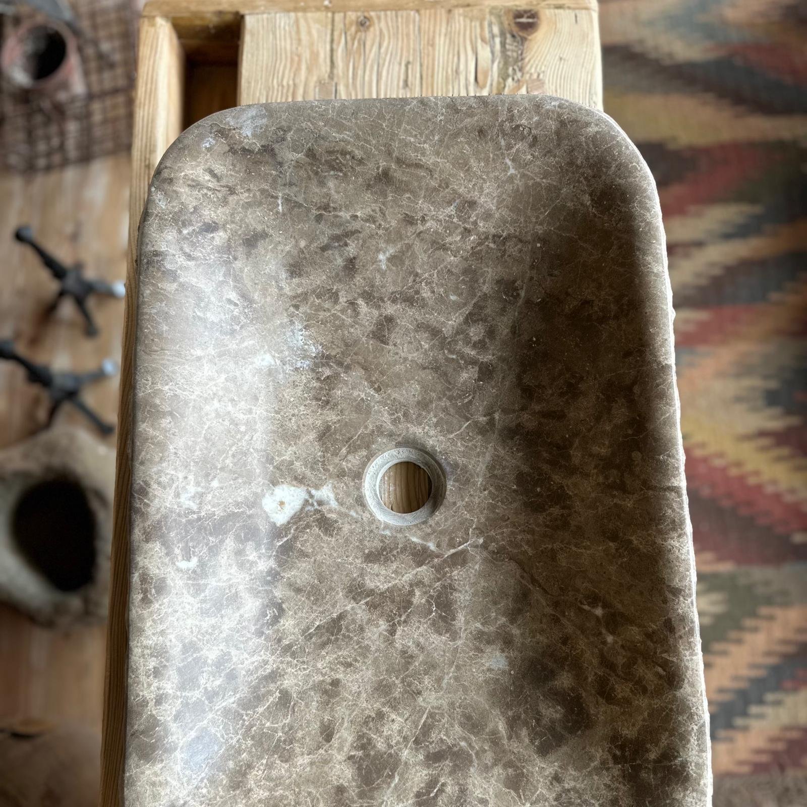 Cada unidad es tallada a mano a partir de piedra de Tarragona, seleccionada cuidadosamente por su resistencia y belleza. Su forma rectangular de bordes redondeados y proporciones equilibradas la convierten en una pieza funcional y decorativa a partes iguales.