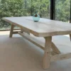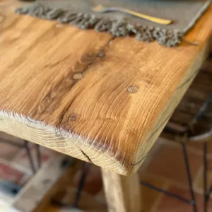 Mesa fabricada en roble viejo recuperado, con acabado liso texturizado en color natural. Un diseño sencillo y robusto en estilo caballetes que resalta la nobleza de la madera recuperada.
