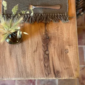 Fabricada en roble viejo recuperado, cada pieza refleja la historia y la fuerza de esta madera noble. Su acabado liso texturizado en tono natural mantiene la esencia original del material, aportando calidez y personalidad a cualquier espacio.