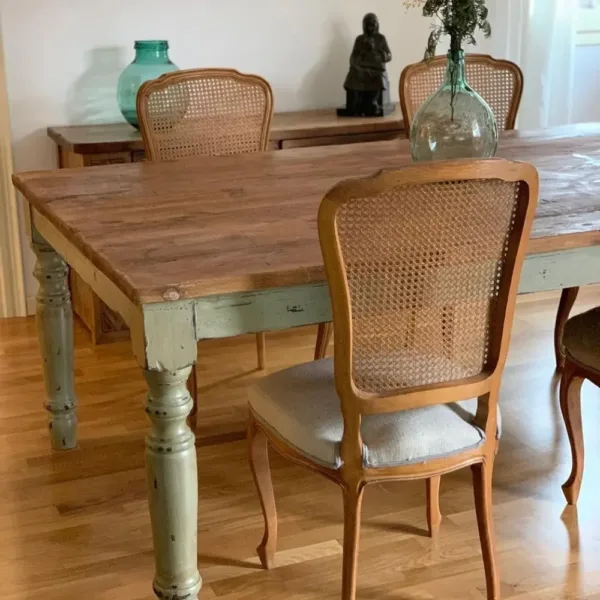 Las patas torneadas con pátina verde oliva añaden un contraste de color delicado y elegante, evocando la tradición mediterránea y el encanto de las casas de campo.