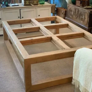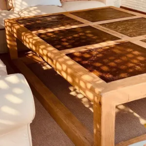 Mesa de centro fabricada en pino viejo recuperado, con acabado liso texturizado en color tostado (T003).