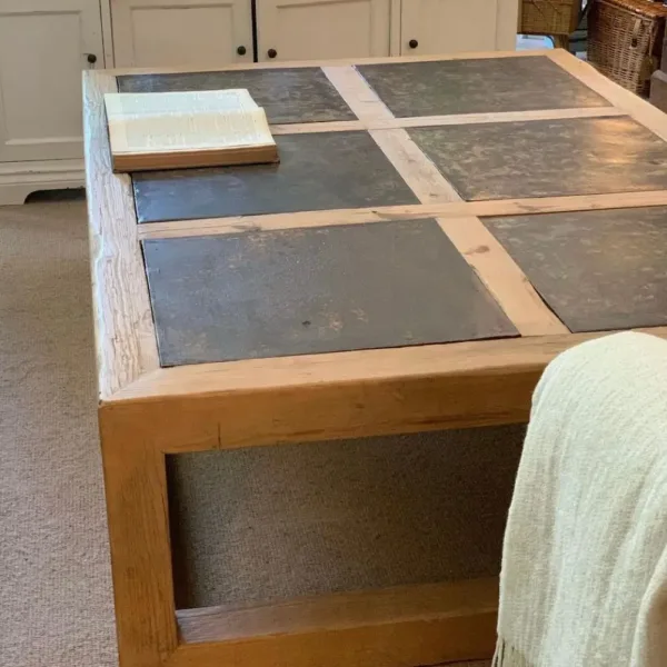 La mesa de centro “Tamariu” es una pieza con carácter que combina la calidez del pino viejo recuperado con la fuerza estética de las chapas de encofrado antiguas.