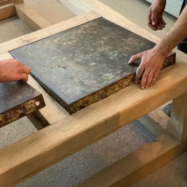 El diseño integra antiguas chapas de encofrado en el sobre, creando un contraste único entre la madera y el metal, mientras que sus patas rectangulares de 7/8 cm aportan solidez y estilo contemporáneo.