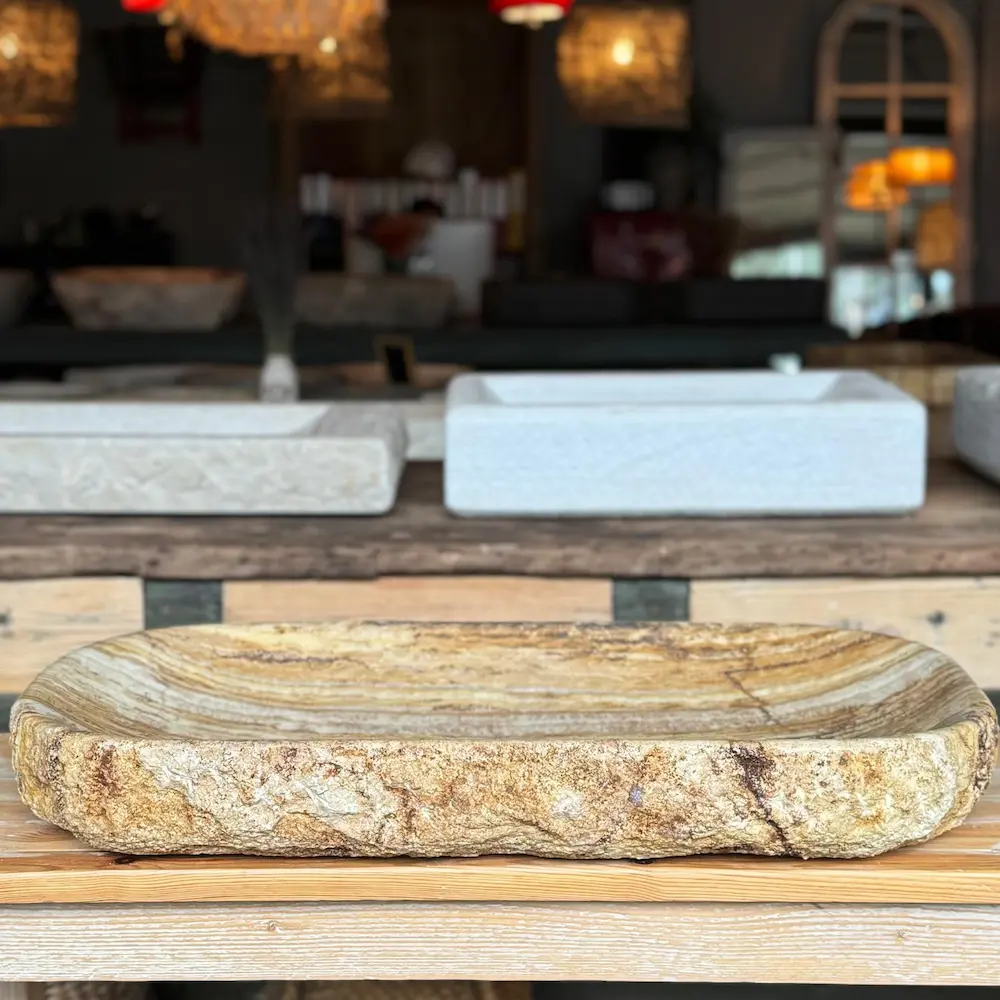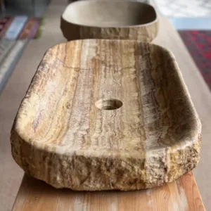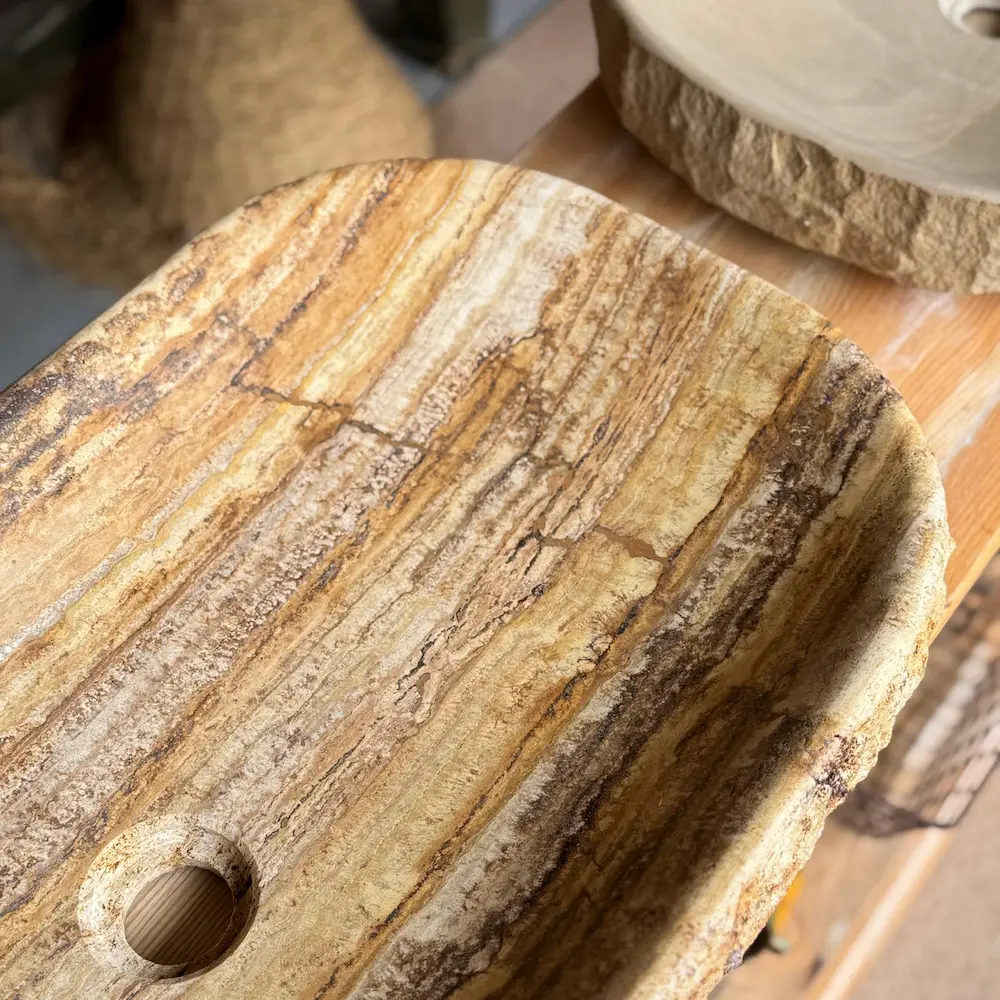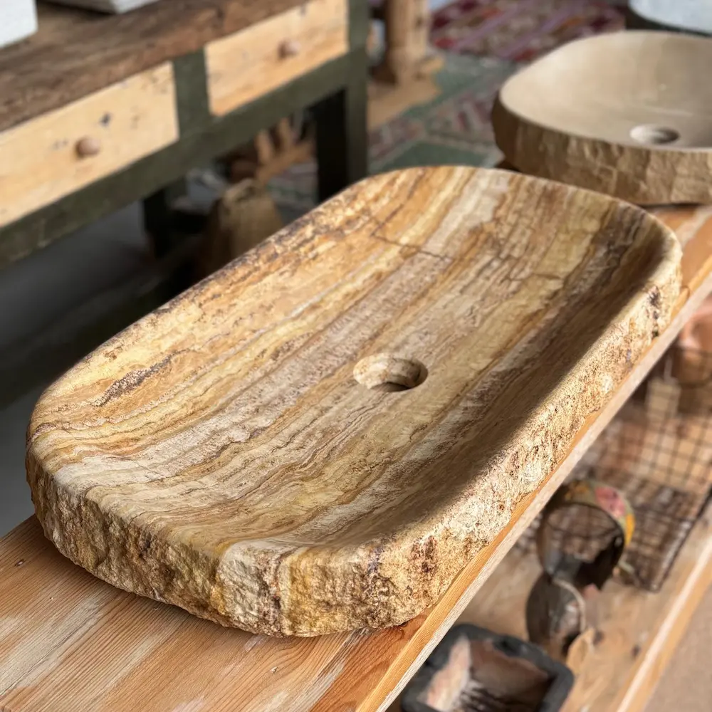 Lavabo sobre encimera tallado en travertino con vetas cálidas y borde natural. Interior pulido con cantos redondeados para uso cómodo y fácil limpieza. Diseño rectangular de perfil bajo: pieza única que aporta carácter mediterráneo y elegancia atemporal.